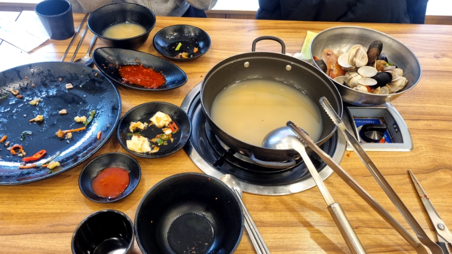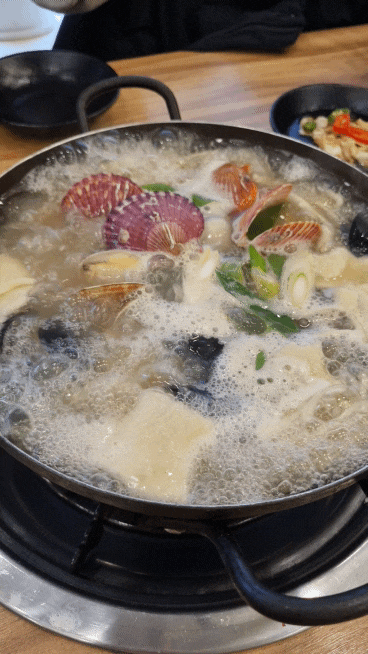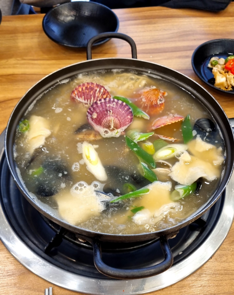 조개 국물에 청양고추 송송 썰어 넣어 칼칼한데 한국인이라면 싫어 할 수 없는 맛입니다.